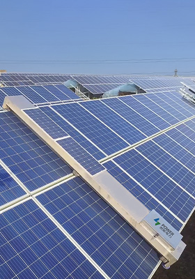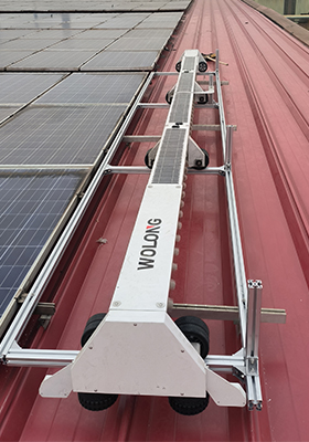 指光伏电站配套安装体积小、重量轻、清洁高效、采用人工智能AI技术的全智能清扫机器人,通过射频物联网通讯方式,采用智能控制管理系统、智能算法和RTK高精度定位系统,实现清扫路径自动规划,具有自主导航、自主定位、自主清洁、自主充电和断点续扫等功能,对光伏电站进行表面清洁处理。光伏清扫机器人在解决清洁困难的同时,其高清洁、高可靠性、低成本等优势大大降低了光伏电站后期运营成本,有效提升光伏电站发电量,增加经济收益。